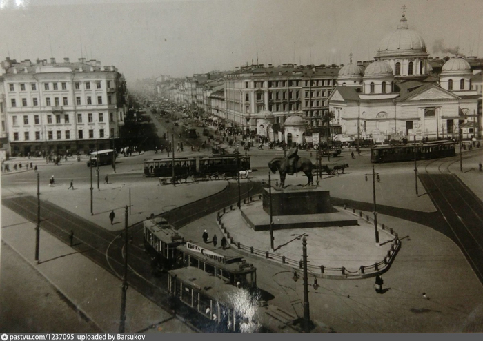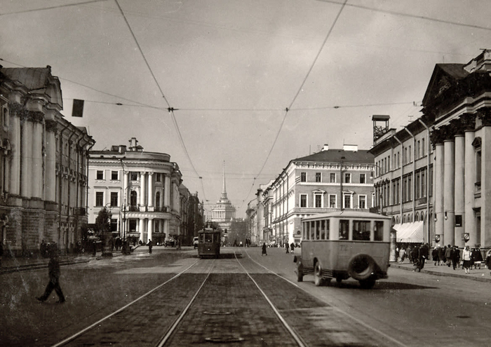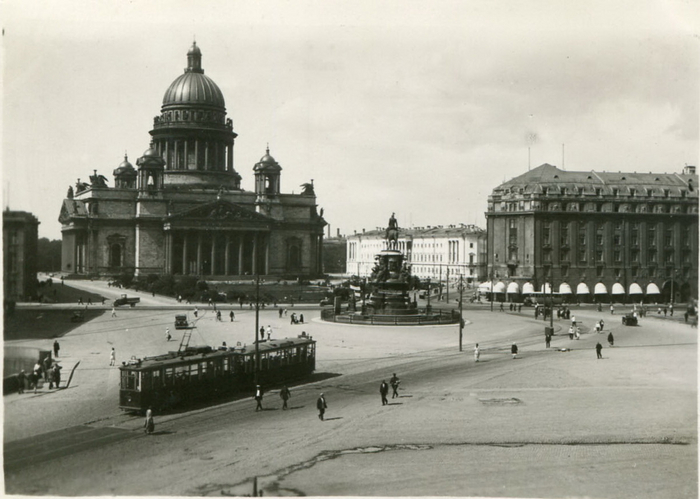 Закончился процесс прокладки новой трамвайной линии по Исаакиевской площади (тогда она называлась площадью Воровского) и трамвай вовсю носятся на фоне Исаакиевского собора.