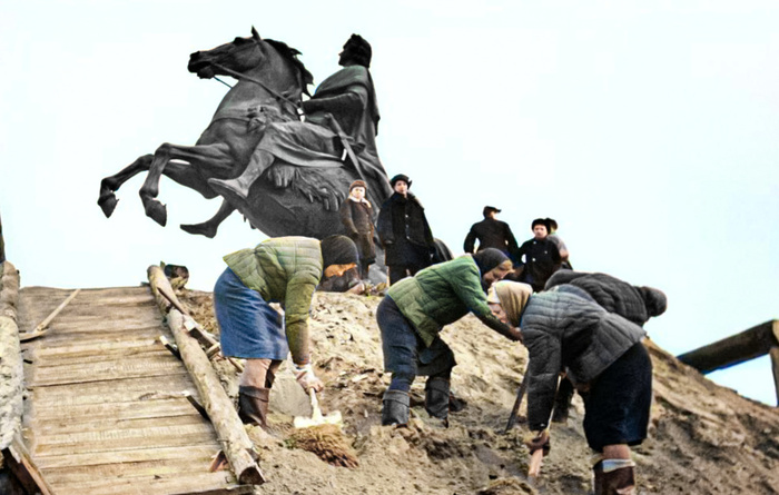 Жители Ленинграда освобождают памятник Петру Великому от защитных укрытий. Снимок сделан после снятия блокады города в 1944 году.