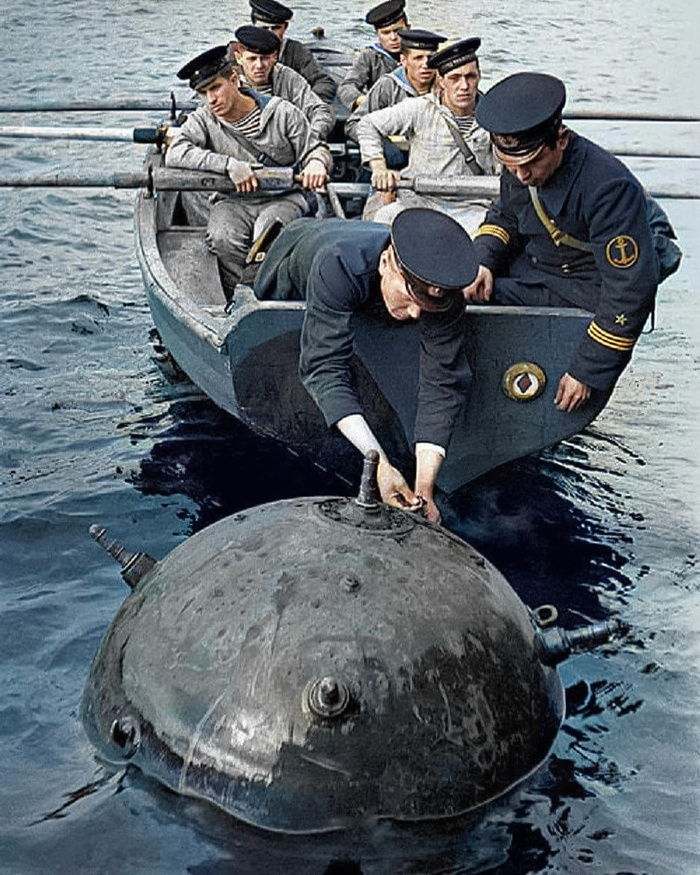 На фотографии гальваноударная мина. При касании борта корабля происходит разрушение колпака и уже потом детонация. Поэтому моряки так смело подплыли к ней.