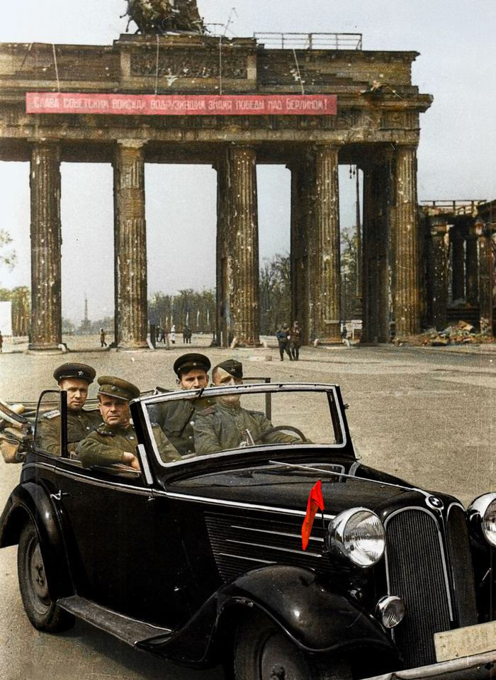 Советские офицеры в трофейном автомобиле БМВ 319 у Бранденбургских ворот Берлина, 1945 год.
