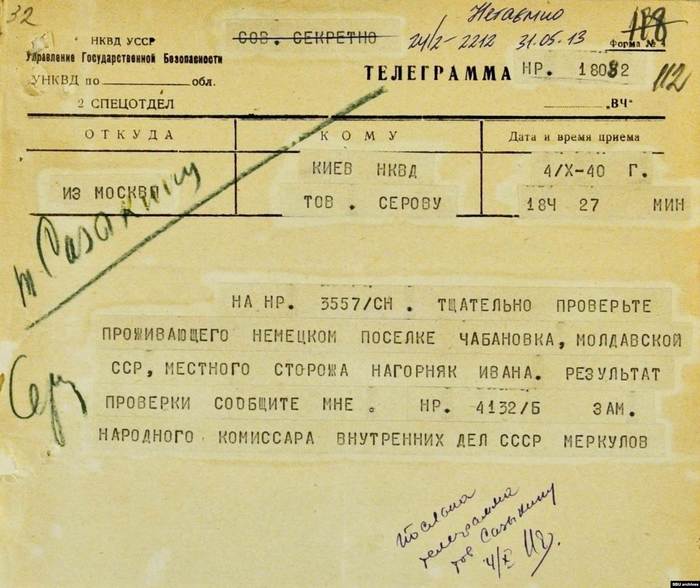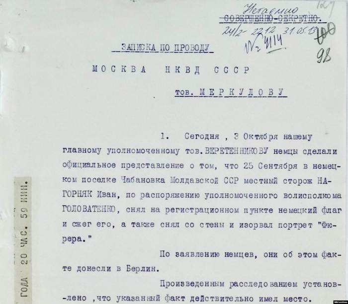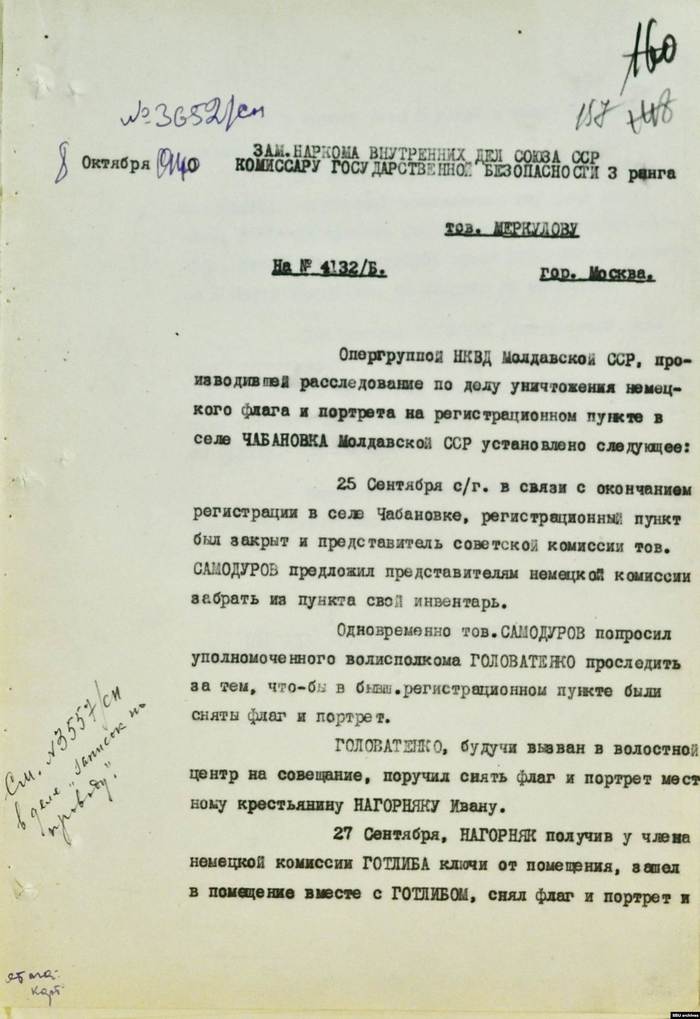 В начале октября 1940 года из Кишинева в Киев пришло сообщение о чрезвычайном происшествии в молдавском селе Чабановка. Утверждалось, что местный сторож Иван Нагорняк «на регистрационном пункте забрал немецкий флаг, сжег, снял со стены портрет фюрера и изорвал».