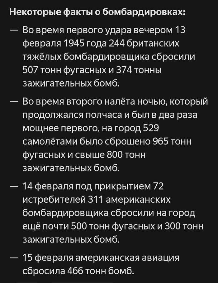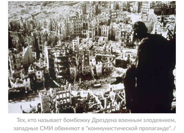 Многие историки уверены, что с военной точки зрения уничтожать Дрезден повода не было. Но британцы с американцами преследовали другие цели, отличные от противостояния нацистской Германии. В это время уже разрабатывались планы операции "Немыслимое", которая предусматривала "силовое вытеснение" советских войск из Польши. И бомбардировка Дрездена должна была продемонстрировать СССР всю мощь западной военной машины. Об этом прямо говорилось в меморандуме британских ВВС: "Бомбардировка Дрездена должна показать русским, когда они прибудут в город, на что способны Королевские ВВС". Жизнь простых людей и архитектурное наследие никого ни в Лондоне, ни в Вашингтоне не волновали. Как не волнуют и сейчас. И никто впоследствии не извинился за содеянное преступление против гражданского населения Германии.