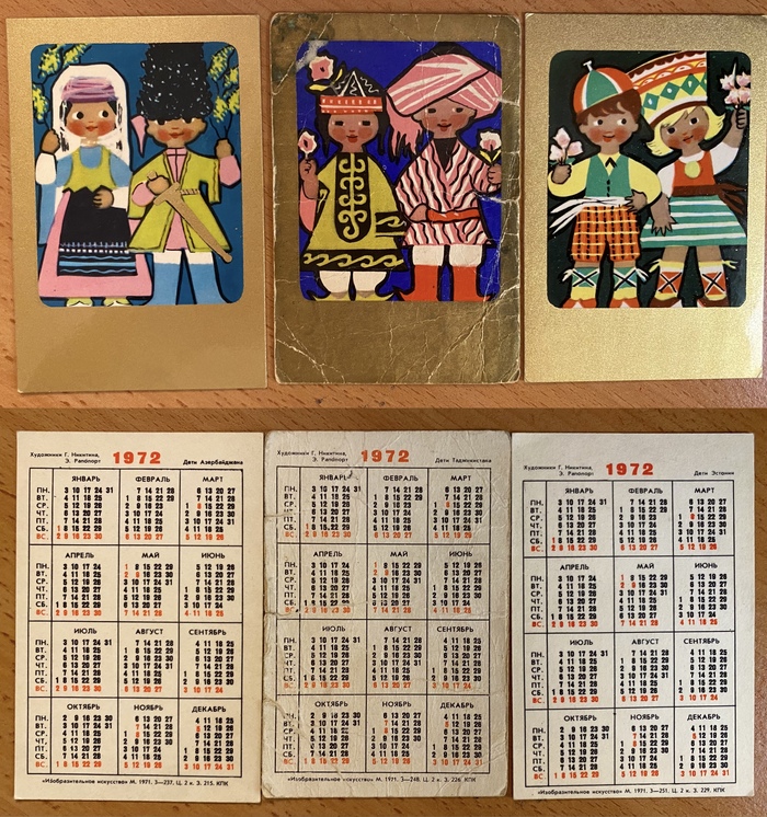 В серии 15 календариков - от России до Литвы, от Азербайджана до Эстонии: дети в национальных костюмах. Разбила по 3 календарика, чтобы можно было лучше рассмотреть детали.