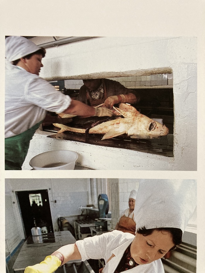 После удаления мембраны, скрепляющей икру, икра приобретает привычный блестящий серо-черный цвет и мелкозернистость. Инспектор контроль качества, поскольку он может брать образцы из каждой банки до того, как она будет закрыта. К тому времени, как банки по девять унций доберутся до капиталистических стран, они будут стоить более тысячи долларов за штуку.