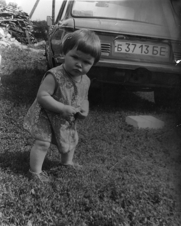 Вон там в левом верхнем углу дрова свалены. Как раз за ними аккурат прятался этот сортир. Вот такие вот времена! А это сестрёнка младшая позирует в новых красных башмачках незаметных на фоне зелёной травы перед домом. Запорожец, кстати, тоже ярко красный как пожарная машина.
