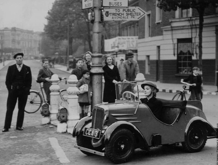 Маленькая машина на фото это "Райтикрафт Скутакар" созданный в начале 1930х годов британским предпринимателем Джеком Шилланом. Идея пришла к нему когда он наблюдал за маленькими бамперными машинками на автодроме. У него в голове возник интересный вопрос, что если сделать такую же малышку, но с бензиновым двигателем для города?