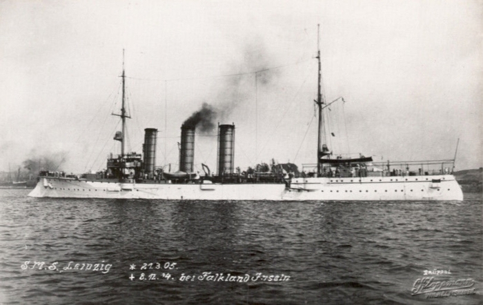 В течение четырех часов Корнуолл и Глазго занимались Лейпцигом. Немцы оказали упорное сопротивление, хотя шансов против англичан у них не было. Неприятель не спускал флага и британские корабли подошли ближе и их стрельба ".....буквально выкашивала столпившиеся группы людей и привела к ужасающей бойне. Многие пытались укрыться за орудийными щитами, но были изрублены на куски осколками снарядов, рикошетирующими от боевой рубки... Другие прыгали в воду и плыли к противнику, но холодная вода убивала их. Никто из них не спасся... Тем временем поднялась волна, и корабль начал раскачиваться... Сгустившиеся темнота и туман мешали видеть противника. Уцелевшие во главе с капитаном собрались на полубаке».(с) А.Больных, Схватка гигантов. В полдевятого вечера на Лейпциге открыли кингстоны и корабль пошел ко дну, не спустив флага. Британцы спасли всего 18 человек...