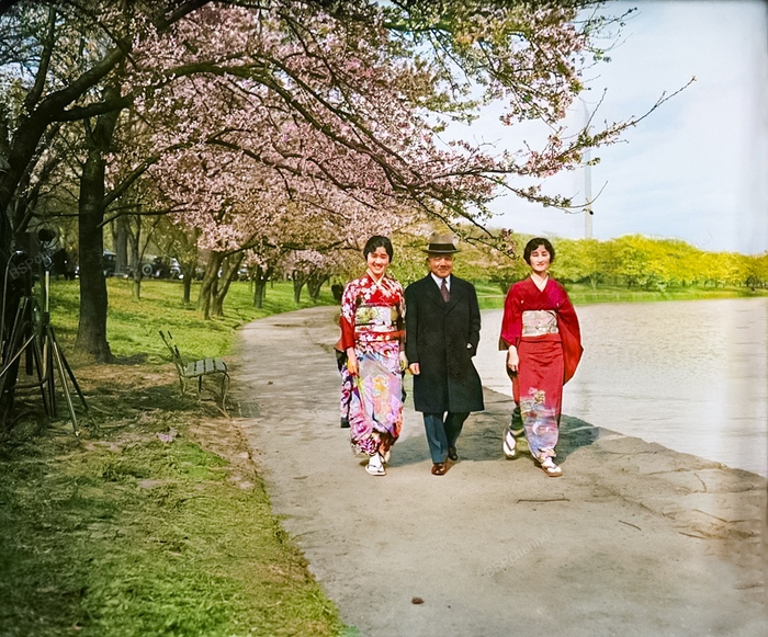 Японцы гуляющие на фоне цветущей сакуры. Вашингтон, округ Колумбия, 1932 год.