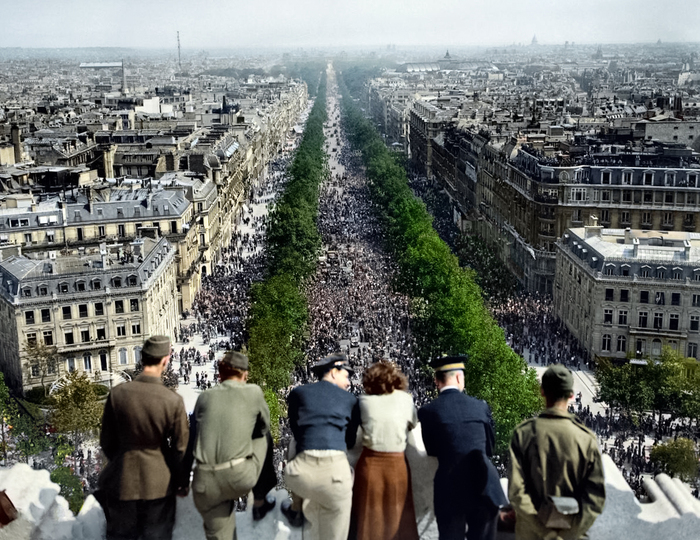 Елисейские поля с Триумфальной арки, День Победы. Париж, Франция, 8 мая 1945 года.