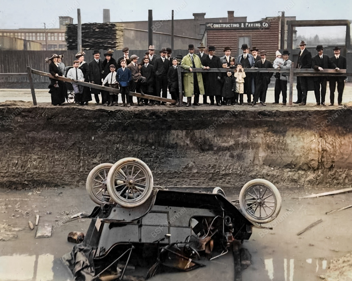 Толпа смотрит на разбитый автомобиль в канаве, примерно 1910 год.