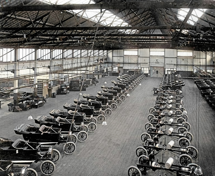 Автомобили Ford Model T выстроились в длинные ряды на конвейере. Эта модель стала настоящим хитом: с 1913 по 1923 год она оставалась самым продаваемым автомобилем в Великобритании. Изначально, с 1911 года, сборка велась из импортных комплектующих, но уже к 1924 году доля британских деталей достигла 94%. В 1931 году Ford перевёл всё производство на новый, масштабный завод в Дагенхэме, графство Эссекс.