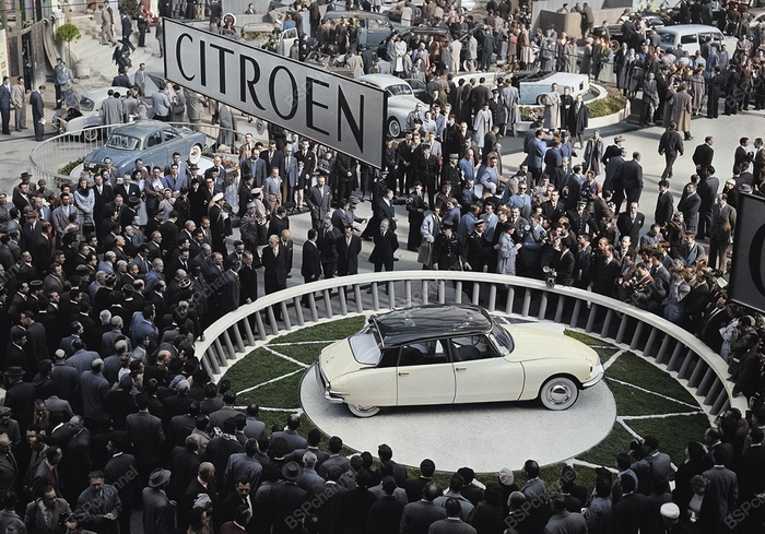 Толпа зрителей вокруг Citroen DS на Парижском автосалоне в октябре 1955 года.
