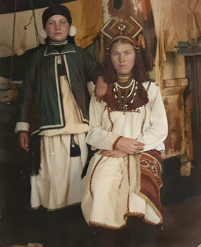 Девушка и молодуха (молодая замужняя женщина) в традиционных праздничных костюмах.