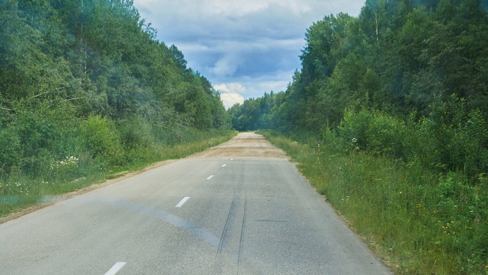 Тут асфальтовая дорога внезапно и одномоментно превращается в грунтовку. Наверное, бабки на этом моменте кончились.