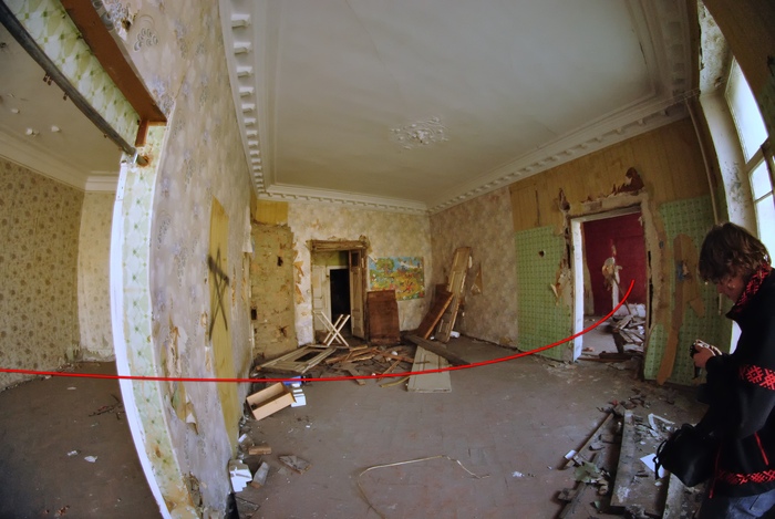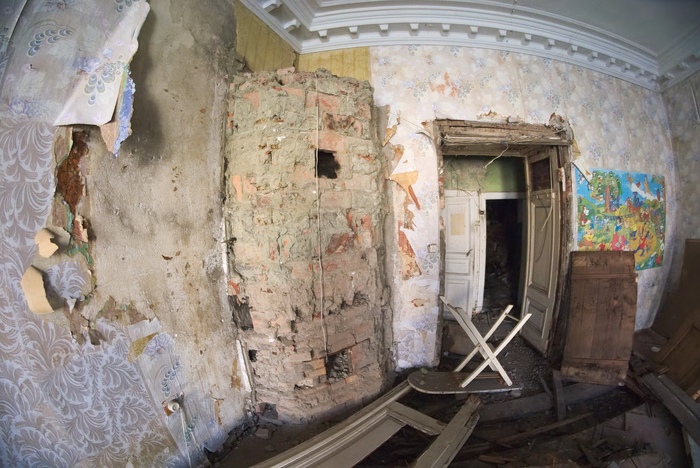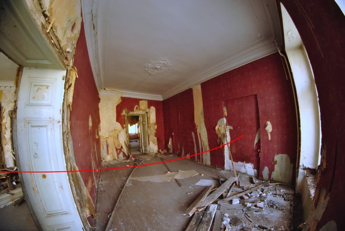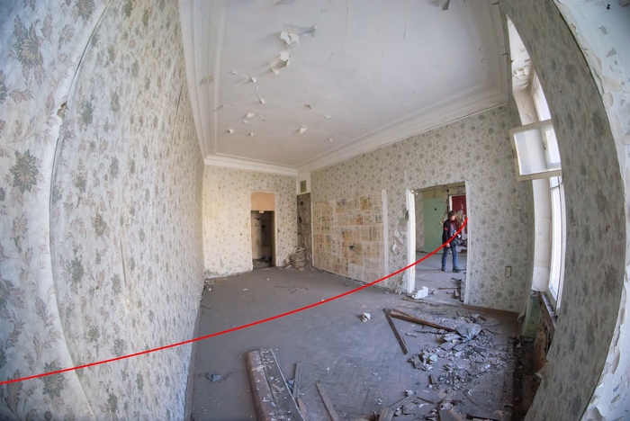 На этих снимках не вся квартира Лермонтова. Красная линия с обеих сторон упирается в заделанные дверные проёмы, за которыми ещё комнаты. На втором фото (где светленькая комната) красная линия слева утыкается в дверной проём, заклеенный обоями. За ним, если память не подводит, находится эта комната: