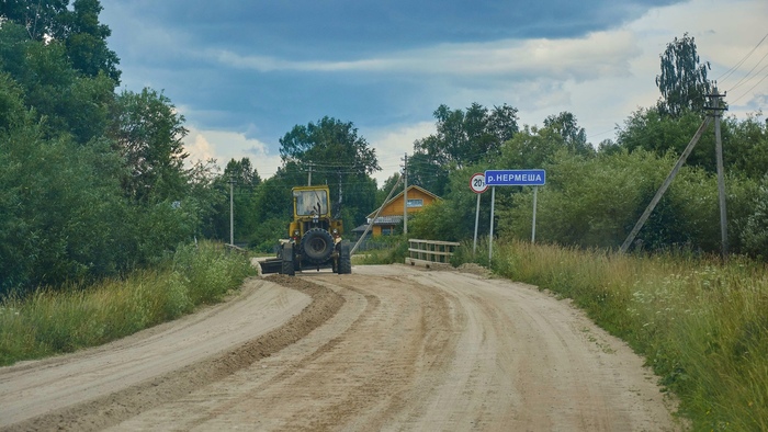 Вот вам грейдер и река Нермеша. Мост деревянный, но нас держит. Мы на ГАЗике, кста.
