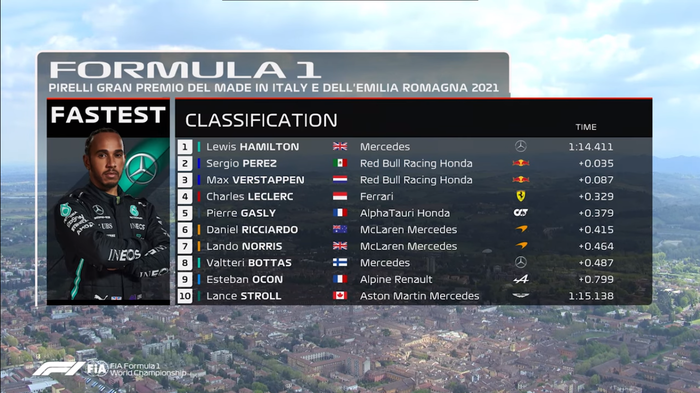 Махач был интересный! Хэм традиционно занял поул. Кстати, его время (1:14.411) намного медленнее прошлогоднего (Боттас, 1:13.609), потому что в прошлом году Имола принимала гран-при в ноябре, было гораздо теплее, и машины ещё имели полноценные днища, дававшие больше прижимной силы. Ландо Норрис выдал сенсационное время, зажёг все отрезки пурпурным, но на поул ему чуть-чуть не хватило, только второй. Однако, вторым он был недолго - его попытку списали за нарушение пределов трассы, и он скатился даже ниже напарника. Время Лэнса Стролла тоже снесли - возможно, если бы не это, он был бы не последним в десятке. В любом случае, он переквалифицировал Феттеля, выполнив задачу-минимум. Серхио Перес внезапно уделал Макса Ферстаппена, потому что Макс допустил ошибку в последней попытке и не смог до него дотянуться. Шарль Леклер традиционно героически тянет своё красное ведро как можно выше, чтобы потом слить позиции в гонке. Кстати, Попов сегодня ту же мысль по ходу трансляции выразил. Впрочем, в прошлом году, когда всё было ещё хуже, даже тогда ему перепадали подиумы. Пьер Гасли - на уровне, Дэн Риккьярдо - на уровне, Боттас... Дядь, ты какого члешего на 8 месте забыл? Эстебан Окон - на уровне.