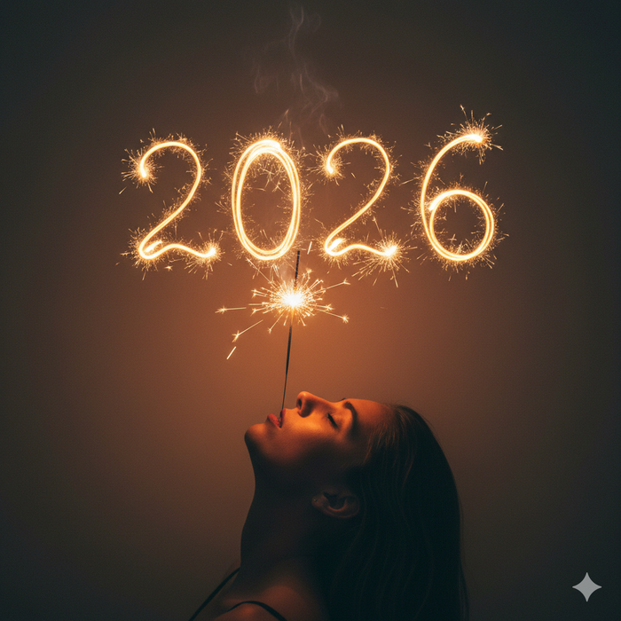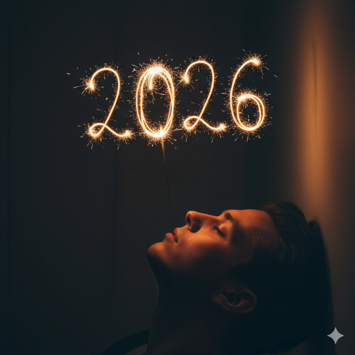 Темный фон критически важен: он позволяет искрам «2026» ярко светиться и быть читаемыми, а также усиливает контраст между освещенной частью лица и тенью. Атмосферные детали вроде тонкого завитка дыма, поднимающегося от бенгальского огня, добавляют реализма и создают ощущение живой фотографии, а не компьютерной графики.
