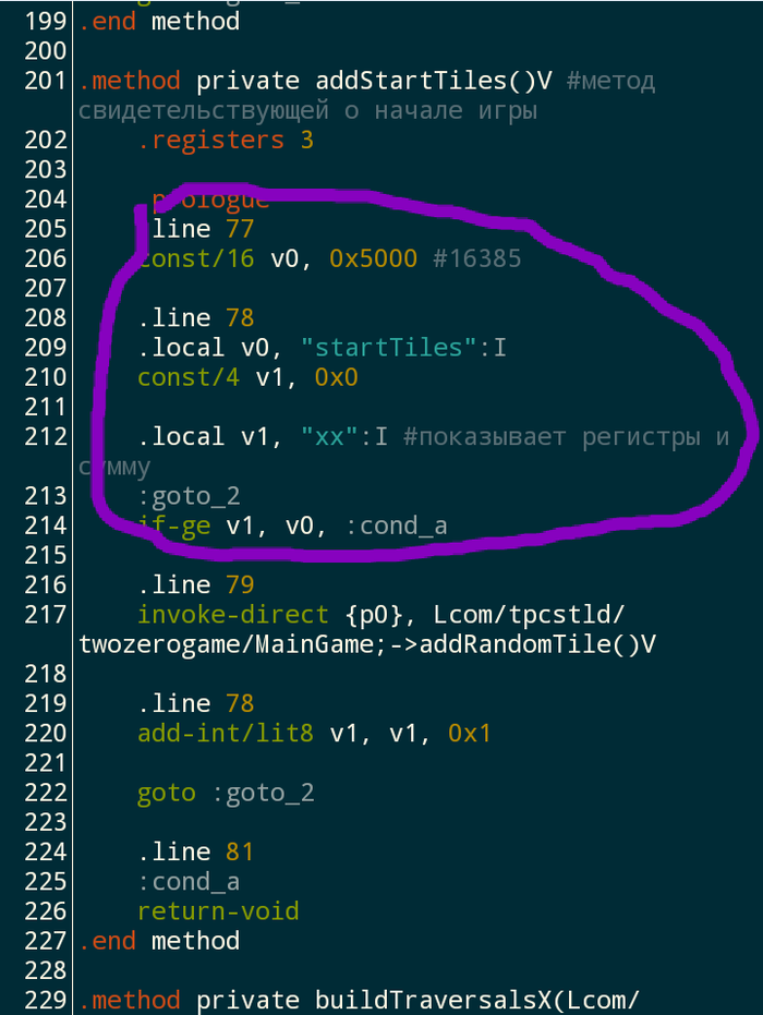 Первое с чего я начал так это с того, что закинул apk в онлайн декомпилер (java decompiler), чтобы посмотреть в каком методе рализована генерация чисел. Это оказался addStartTile()V. И вот реализация этого метода в smali.