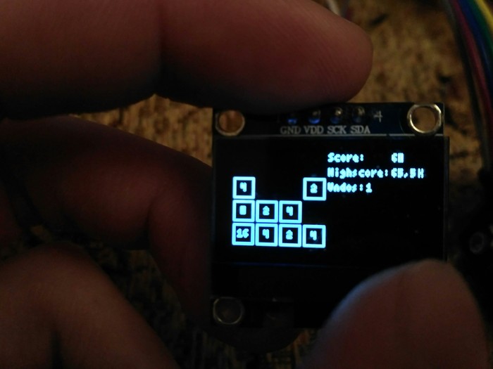 В игре реализован подсчет счета, рекорда(с записью рекорда в EEPROM), а так же 1 отмена за игру. Как показала практика, самое сложное это отображение. Сложно сделать его достаточно красивым при таком разрешении. Саму обработку игрового процесса можно продумать и реализовать за пару часов.