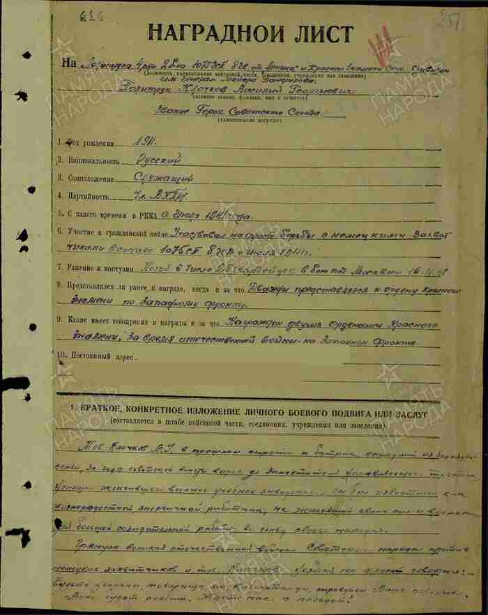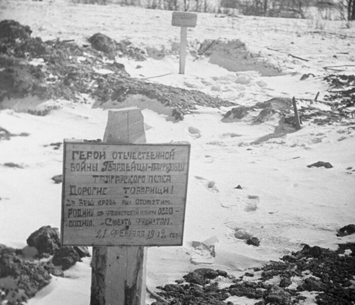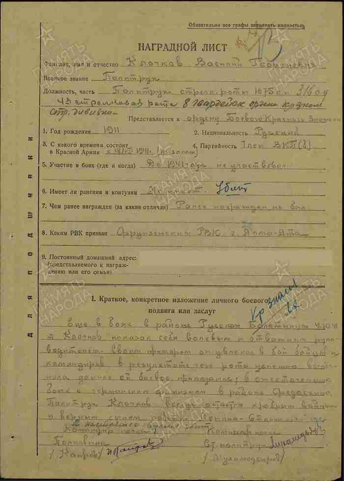 "Пусть армия и страна узнают, наконец, их гордые имена. В окопе были: КЛОЧКОВ Василий Георгиевич, ДОБРОБАБИН Иван Евстафьевич, ШЕПЕТКОВ Иван Алексеевич, КРЮЧКОВ Абрам Иванович, МИТИН Гавриил Степанович, КАСАЕВ Аликбай, ПЕТРЕНКО Григорий Алексеевич, ЕСИБУЛАТОВ Нарсутбай, КАЛЕЙНИКОВ Дмитрий Митрофанович, НАТАРОВ Иван Моисеевич, ШЕМЯКИН Григорий Михайлович, ДУТОВ Петр Данилович, МИТЧЕНКО Николай, ШАПОКОВ Душанкул, КОНКИН Григорий Ефимович, ШАДРИН Иван Демидович, МОСКАЛЕНКО Николай, ЕМЦОВ Петр Кузьмич, КУЖЕБЕРГЕНОВ Даниил Александрович, ТИМОФЕЕВ Дмитрий Фомич, ТРОФИМОВ Николай Игнатьевич, БОНДАРЕНКО Яков Александрович, ВАСИЛЬЕВ Ларион Романович, БОЛОТОВ Николай, БЕЗРОДНЫЙ Григорий, СЕНГИРБАЕВ Мустафа, МАКСИМОВ Николай, Ананьев Николай"...