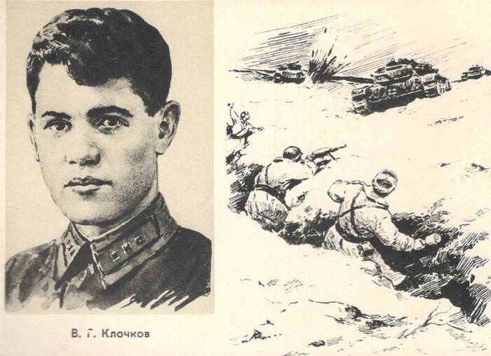 "...Бой длился более четырех часов. Уже четырнадцать танков недвижно застыли на поле боя. Уже убит сержант ДОБРОБАБИН, убит боец ШЕМЯКИН... мертвы КОНКИН, ШАДРИН, ТИМОФЕЕВ и ТРОФИМОВ... Воспаленными глазами КЛОЧКОВ посмотрел на товарищей - "Тридцать танков, друзья, - сказал он бойцам, - придется всем нам умереть, наверно. Велика Россия, а отступать некуда. Позади Москва... "Прямо под дуло вражеского пулемета идет, скрестив на груди руки, КУЖЕБЕРГЕНОВ и падает замертво"...