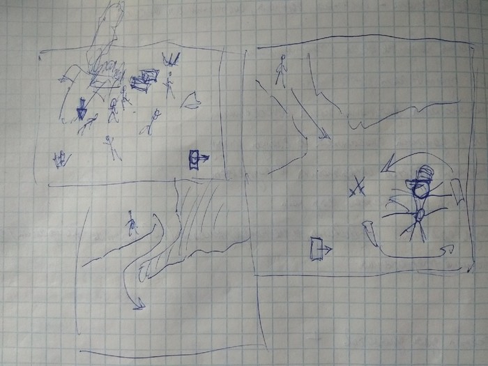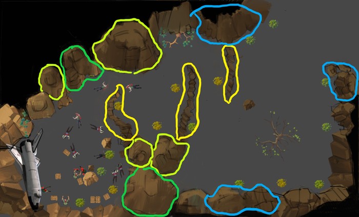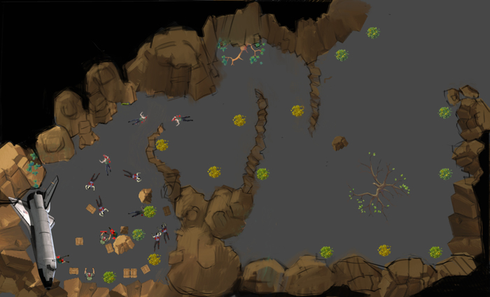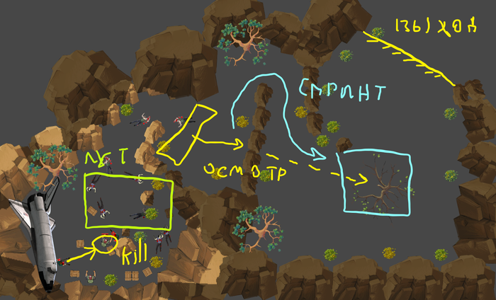 Утвердив сценарий прохождения и границы уровня, можно приступить к детализации окружения. Ниже был сделан скетч поверх скриншота.