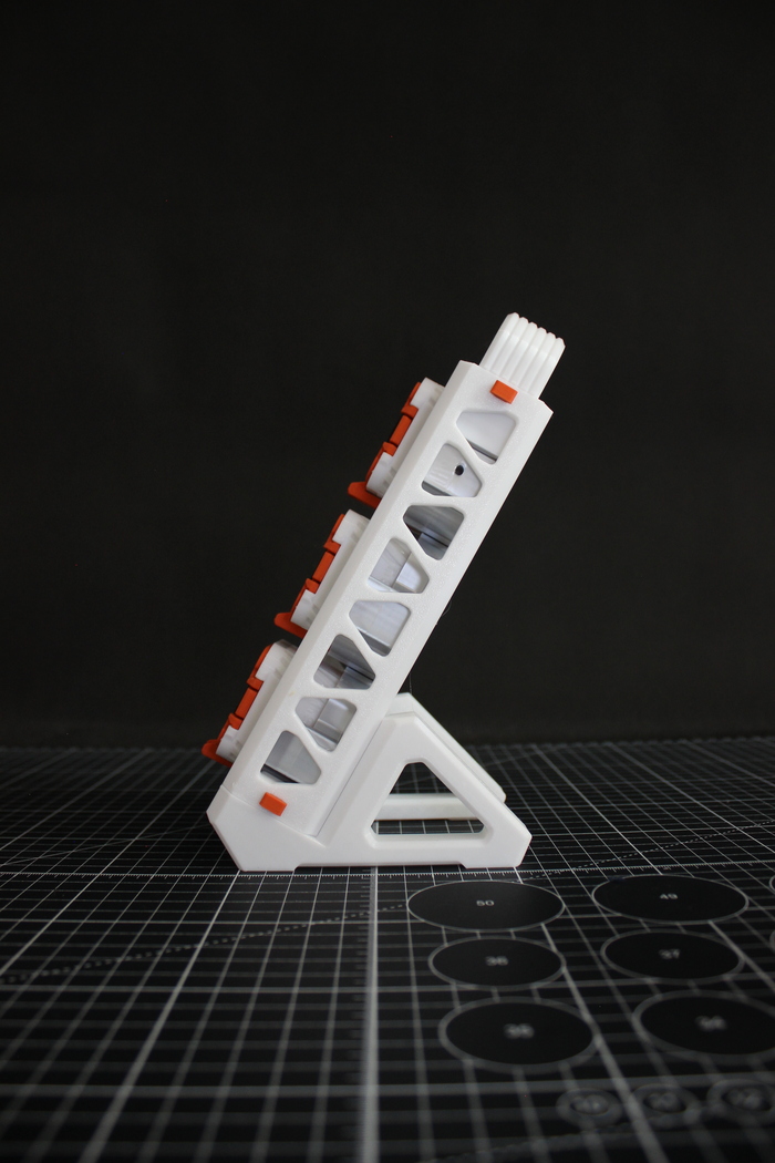 Я сознательно отказался от внешних креплений. Вся система строится только из напечатанных деталей. Нет покупных рейлингов, стеллажей, или полок.