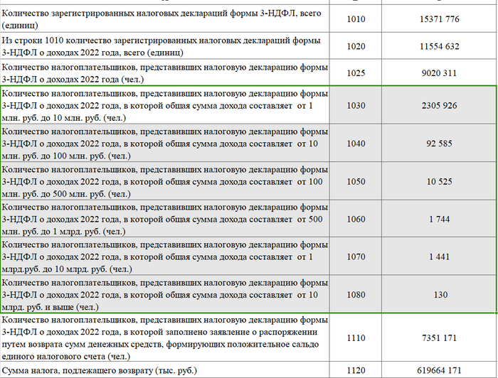 На картине представлены вырезка из сведений о поданных налоговых декларациях по форме 3-НДФЛ о доходах, полученных в 2022 году. Количество наших с вами сограждан, которые задекларировали доходы от 1 млн ₽ до 10 млн ₽ и т.д.