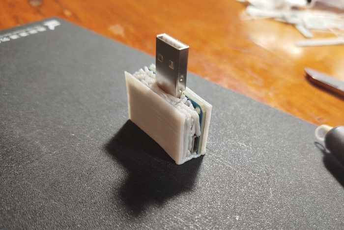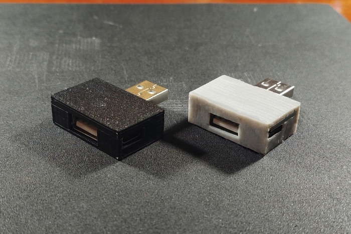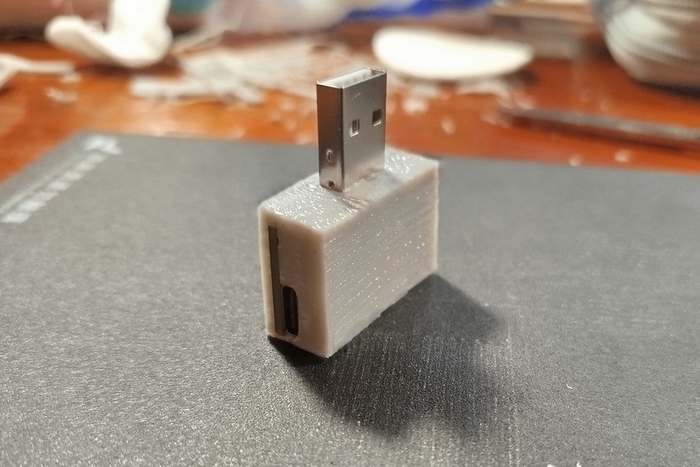 Получилось не с первого раза - первый раз немного не угадал с размерами, пришлось печатать исправленную модель повторно. Так что могу сделать предварительный итог. Если сравнить потраченное время на такую простую деталь как корпус USB переходника, то в данном случае у 3D-принтера нет вообще никакого преимущества. Я на то, что бы разложить инструмент, прогреть 3D-ручку и нарисовать деталь потратил скорее даже меньше времени, чем на то, что бы включить компьютер, нарисовать модель, включить 3D-принтер, напечатать в две попытки деталь (а принтер греется не быстро), а затем склеить две половинки.