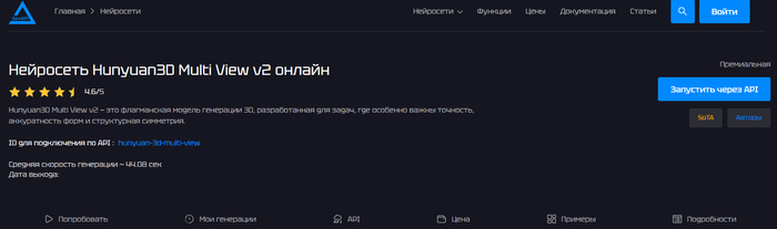 Нейросеть для создания 3D моделей, заточенная под максимально точную геометрию и аккуратную симметрию объектов. Она восстанавливает трехмерную форму по нескольким ракурсам одного предмета (фронт, бок, зад) и за счет этого дает более реалистичный объем, чем классические решения по одной картинке. Среднее время генерации — около 37 секунд за модель, при этом результат можно сразу крутить в интерактивном 3D-превью прямо в браузере. Модель построена на современной диффузионной архитектуре Hunyuan3D 2.0, которая отдельно решает задачи геометрии и текстур, что дает высокий уровень детализации при разумном времени отклика.
