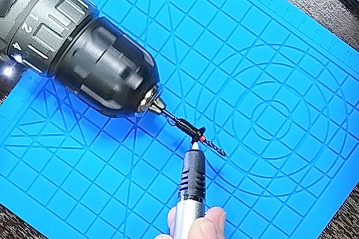 На сверло был намотан кусочек изоленты, который позволил без проблем извлечь заготовку со сверла, а так же изолента без труда была извлечена изнутри заготовки. Затем заготовку я зажал в патроне шуруповерта и с помощью разогретого паяльника придал заготовке нужную форму.