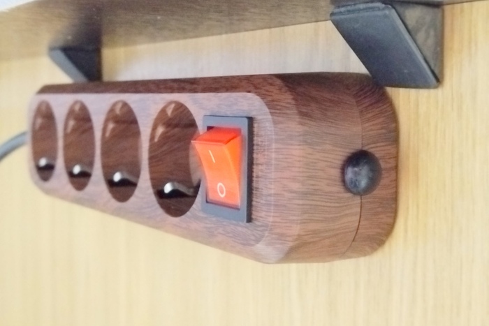 Появилась необходимость смонтировать блок розеток с выключателем под туалетным столиком для того, что бы было куда включить настольный свет, настольное зеркало с подсветкой, фен, утюжок для волос и прочее. В стандартном исполнении выключатель на этом блоке расположен с той же стороны, что и провод, но из эстетических соображений и ради удобства использования я решил провод вывести с обратной стороны, в результате чего на блоке осталось зиять отверстие для провода.