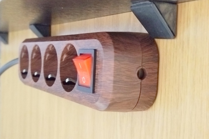 Были так же мысли с помощью 3D-ручки "нарисовать" крепежи для провода (их в наличии дома не было, а заказывать и ждать такой крепеж через интернет - долго), но имеющиеся в наличии пластиковые уголки под столом сами по себе послужили не плохим крепежом и для провода.