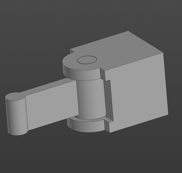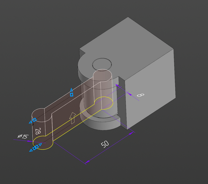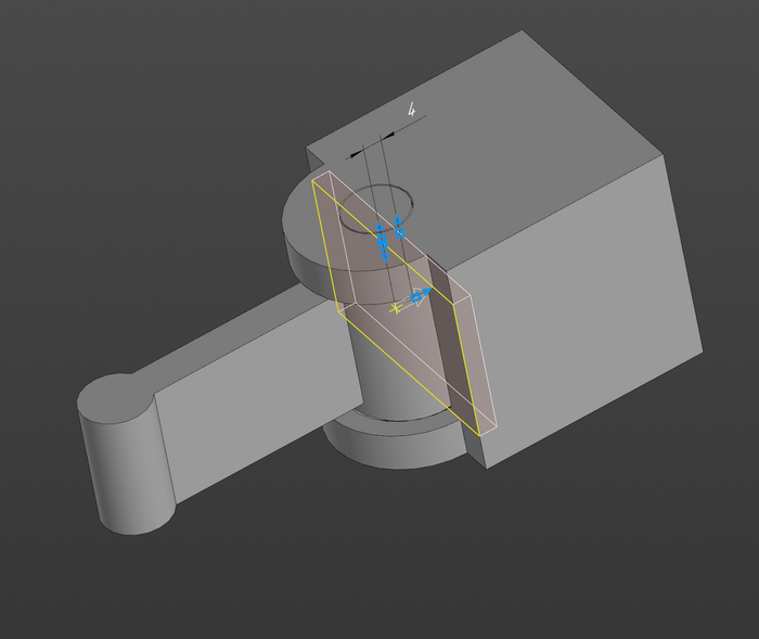 Осталось вырезать кусочек стенки, в половину толщины ручки, чтобы наш эксцентрик поворачивался на 180 градусов. В принципе можно это было сделать поправив чертеж с предыдущего шага, но в тот момент я про это не подумал :)