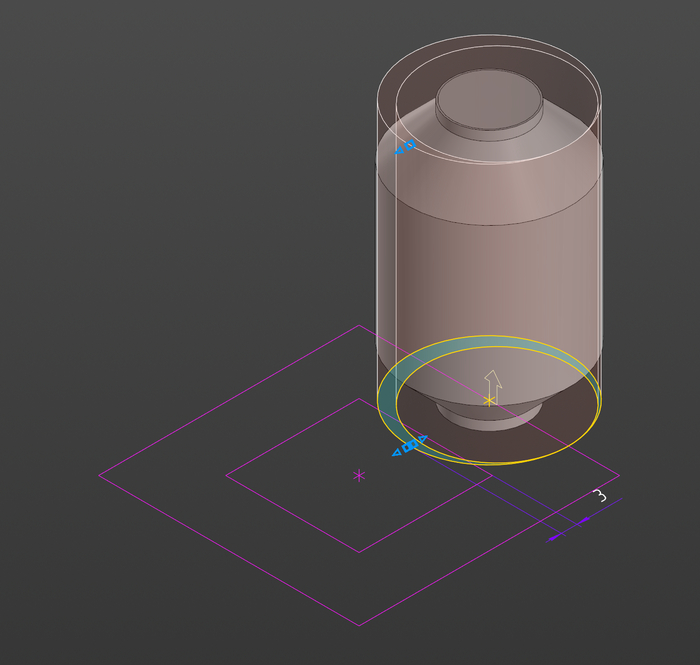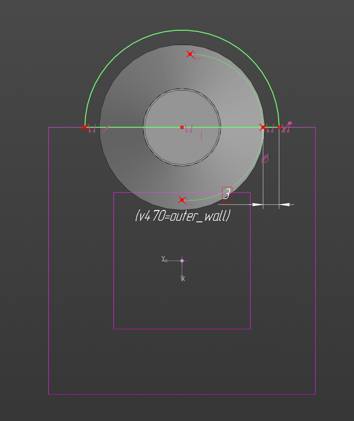 Дальше - рисуем наш эксцентрик. Внешний круг - это вырез, в котором он будет вращаться, внутренний - сам эксцентрик. Круги распологаю так, чтобы при повороте влево на 90 градусов он не выдавался внуть совсем, а при повороте на 90 градусов вправо - выпирал максимально. (в данном случае - на 3 мм)