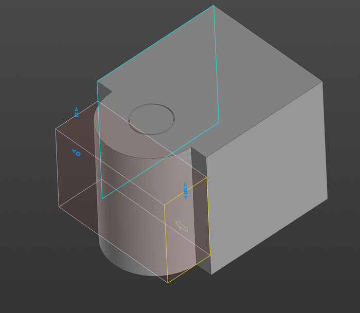 Дальше, делаю еще один эскиз, в основной сборке, и отмечаю там места куда эти цилиндры будут вставлены. Ну и отмечаю там где в стенках нужно добавить вырезы под винты. Потом добавляю в сборку 2 копии детали с цилиндром, и немного вычитаю-складываю-пересекаю.