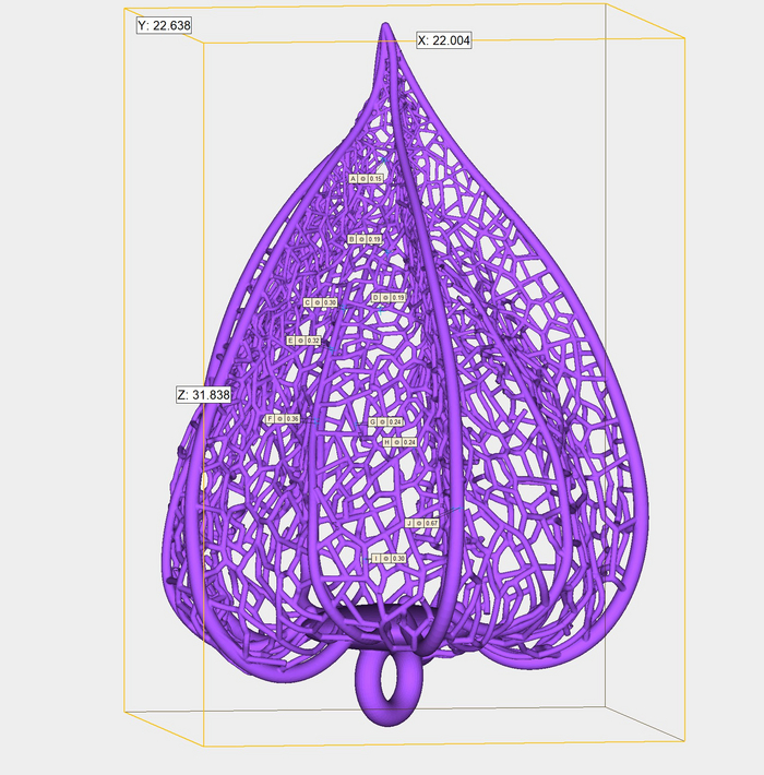 Тончайшие переплетающиеся веточки оболочки и пустотелая форма трудна для воспроизведения ювелиром, поэтому данное украшение создавалось с помощью 3D-печати.