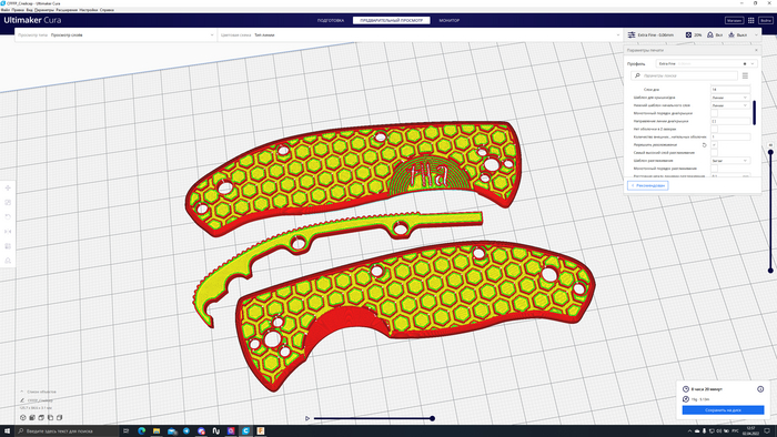 По истечению 9 часов я понял что печатать слоем в 0.06 было ошибкой. Скругления и фаски просто замечательные и мало отличаются по ощущениям от g10, но вот сами соты чуть чуть выгнуло и появились сопли с артефактами.