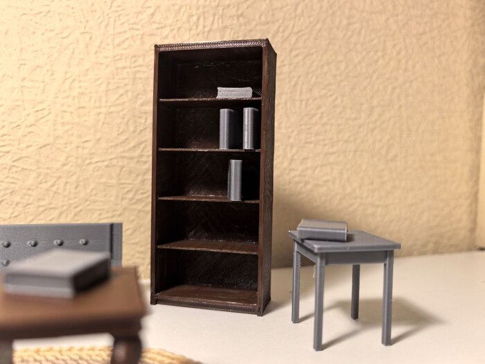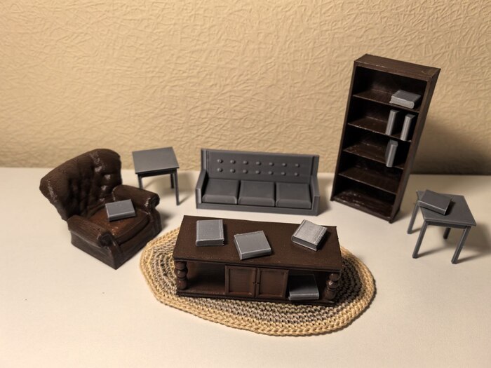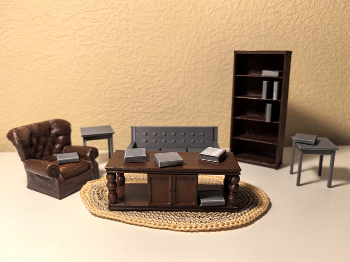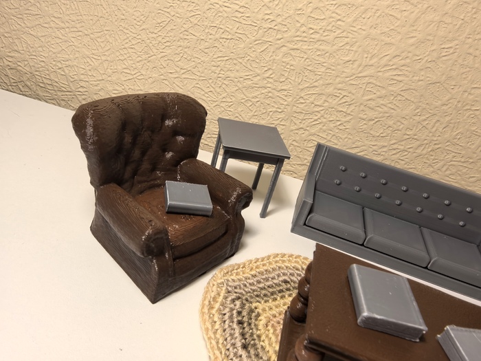 Обстановка будущего дома, как положено, началась с мебели. Она напечатана с помощью 3D принтера (и храни его в здравии) и Thingverse.