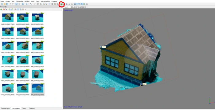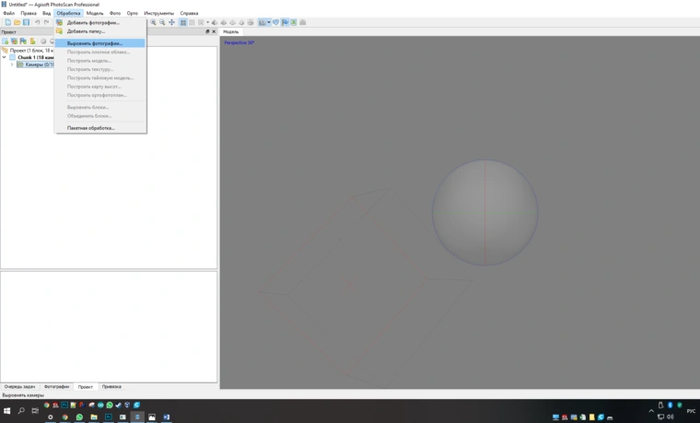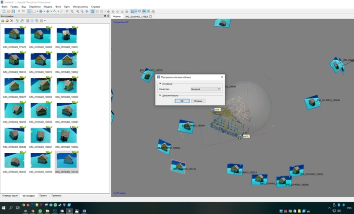 16. Теперь нужно заново проделать операции по преобразованию фотографий в облако точек: «выровнять фотографии», затем «построить плотное облако точек».