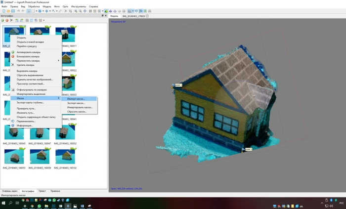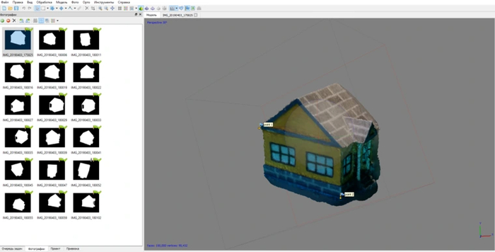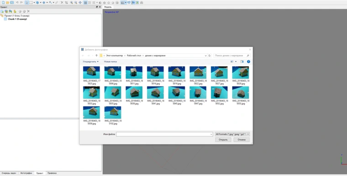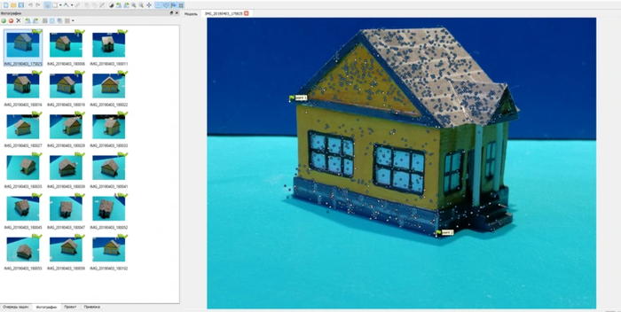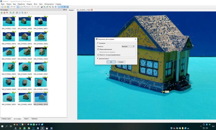 На удивление, даже для тестовой попытки с небольшим количеством фотографий и далеко не профессиональным оборудованием и условиями съемки, PhotoScan правильно определила ракурсы абсолютно всех фотографий — об этом свидетельствуют зеленые галочки под каждой картинкой.