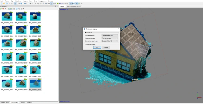 С фоном придется поработать чуть позже. А на этом этапе нужно окончательно конвертировать облако точек в трехмерный объект. Для этого надо зайти в подпункт «обработка» и выполнить операцию «построить модель». Тип поверхности — произвольный (3D), исходные данные — плотное облако точек. Количество полигонов нужно установить на максимум, а после этого требуется только нажать кнопку «ОК».