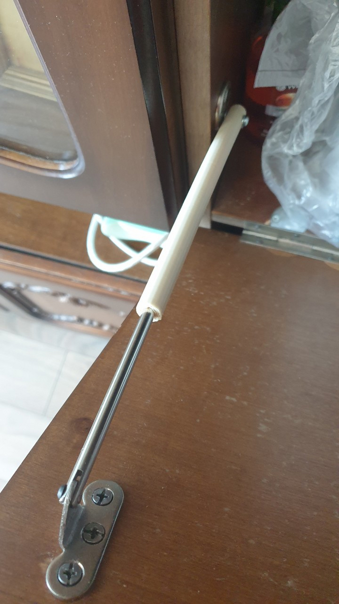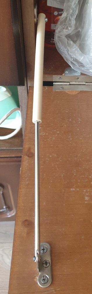 Фоток поломанной детали у меня не осталось, потому рассказываю так. Механизм состоит из двух палок с креплениями друг к другу и к деревянным стенкам. Поломка произошла в креплении палок: разошлось место, которое должно было держать узкую палку внутри широкой. Там металл широкой палки был как бы загнут вовнутрь и не позволял узкой выходить за свои пределы. Со временем эта часть износилась и разогнулась.