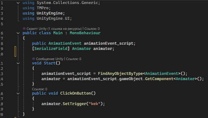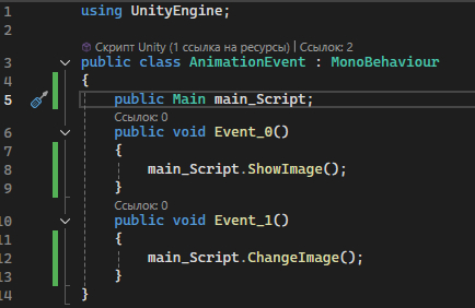Добавляем в AnimationEvent ссылку на Main script, меняем методы на вызов методов Main: