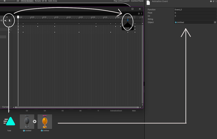 Дважды кликаем на анимации Tuda, создаем Event примерно на 95% анимации, справа в Inspector в поле object перетаскиваем Prefab из Asset, а в function пишем Event_0.