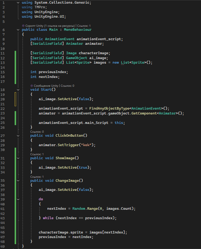 А в Main Скрипте добавляем ссылку на AnimationEvent script, на элементы интерфейса, создаем лист с картинками, добавляет функцию сокрытия\показа картинки и цикл для выбора каждый раз новой не повторяющейся картинки: