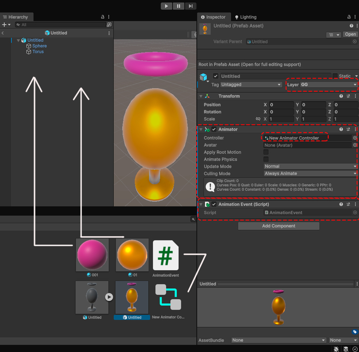 Выбираем GameObject в Hierarchy, заполняем все необходимые поля (кроме Animator):