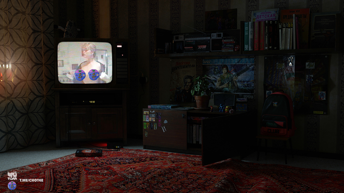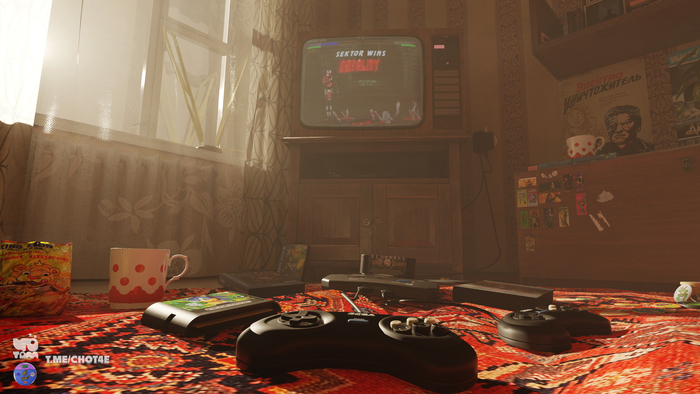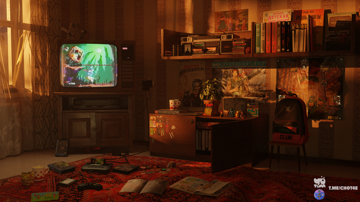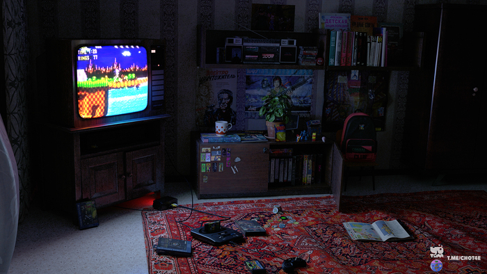 В целом один день проведенный дома будучи ребенком в 90-ые по мне так показан. Есть три вещи на фотках, которые точно отсутствовали в то время это VHS с фильмом "Драйв", аудиокассета с моим альбомом, и еще одна с моим тг-каналом. По поводу подключения сеги к советскому телевизору, я сделал подключение через адаптер к антенне, так как на телевизоре точно отсутствовали входы под AV-кабель\тюльпаны, вроде так было как я понял. Для быстрой работы я опять взял готовые модели с сайта: телевизор, ковер, шкафчики, Vhs плеер, киндер игрушки, растение, бумбокс, йо-йо. Все остальное, включая сегу сделано мной за неделю