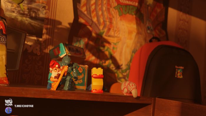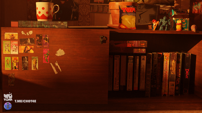 Постер с черепашками ниндзя, взят из альбома с наклейками. Комиксы, что валяется на полу и на столе: советский комикс "Робот полицейский", "Детектив Микки", "Черепашки ниндзя от Archie #2". тетрадь с кодами взята с интернета. по вкусняшкам Коуко Роуко вроде тогда была, насчет бпшки Кинг лиона не знаю, и Сундучок Милки вэй точно был. По игрушкам вроде позволительно добавил робозверя, лего из милки вэя, две игрушки из киндера. Кэпсы/фишки надеюсь были такие в 90-ые, потому что у меня в нулевые были такие же и продавались свежие в ларьках. Кассеты я тоже оформил так, чтоб лицензионных изданий было очень мало в наличии в данной обстановке, и аудиокассеты обложки взяты конечно лицензионные, но пиратские могли вполне также выглядить. Йо-йо надо было бы заменить на две крышки от газировки с веревочкой. Надо будет в будущем для синематика сделать. Многие вещи хотелось бы добавить какой нибудь с тафф с охотниками за приведениями, жвачки турбо и терминатор, головоломки, как кубик рубика и что то еще.